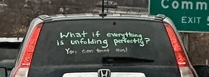 I’ve always been a spiritual person. I read weather, timing and circumstances as God’s language to me. I don’t remember my dreams. God doesn’t speak to me out loud. So I pay attention to what unfolds around me. When we pulled into our new town, we were behind a vehicle with a sentiment written on the back window that read, "What if everything is unfolding perfectly?” What if? What if?
